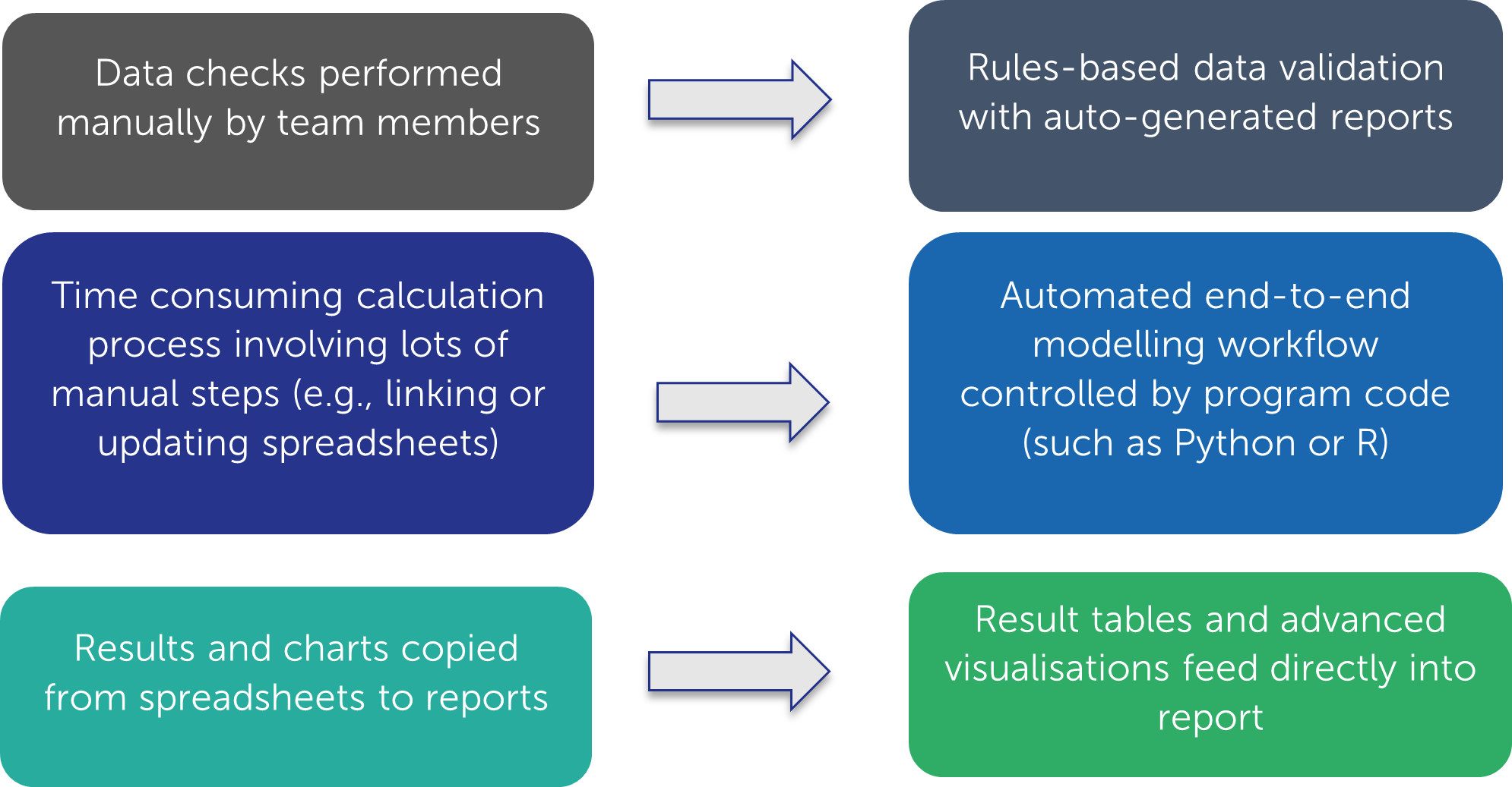 We automate your actuarial, risk or pricing models using advanced scientific computing tools (such as Python or R) so that your team members can focus on value adding analysis.